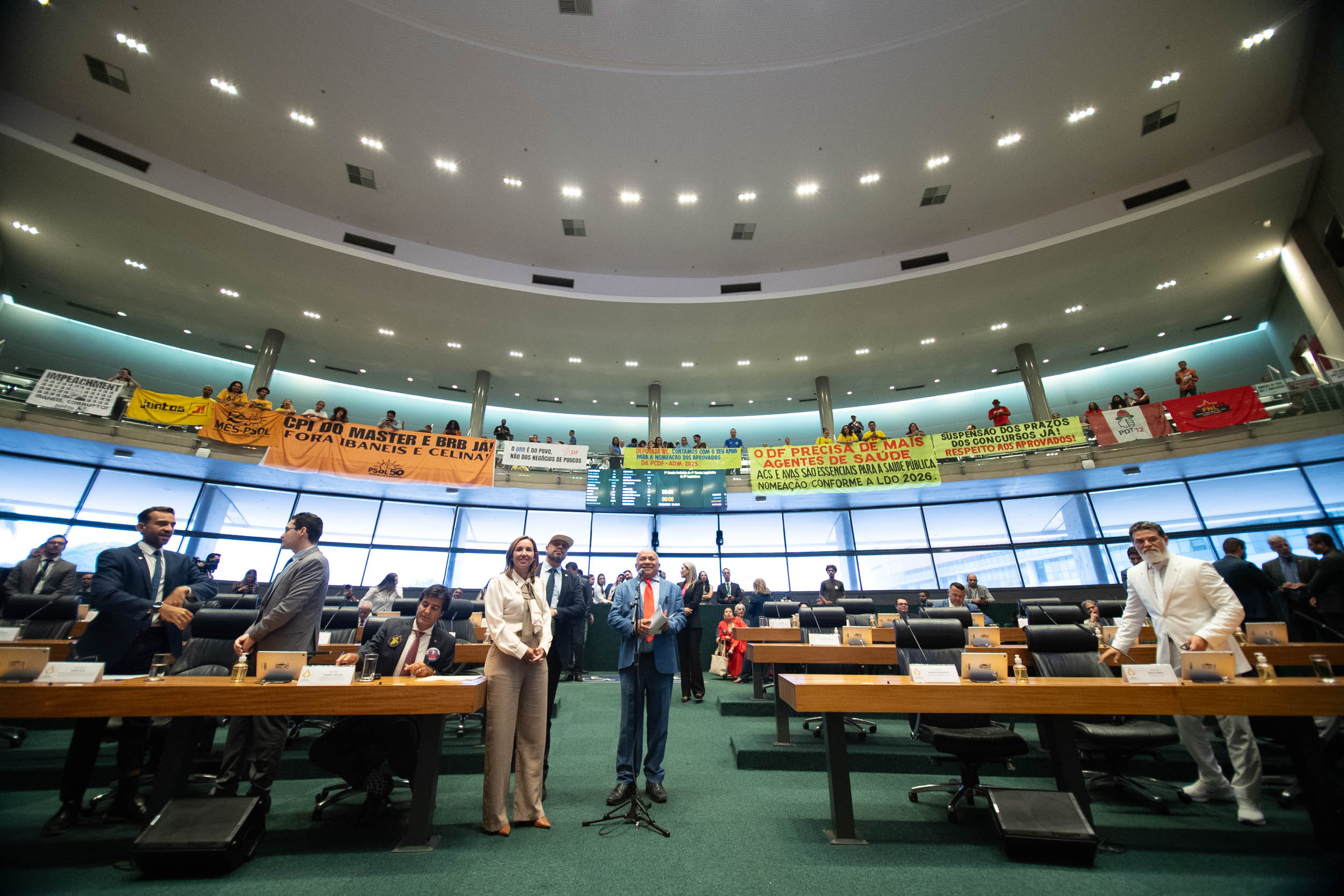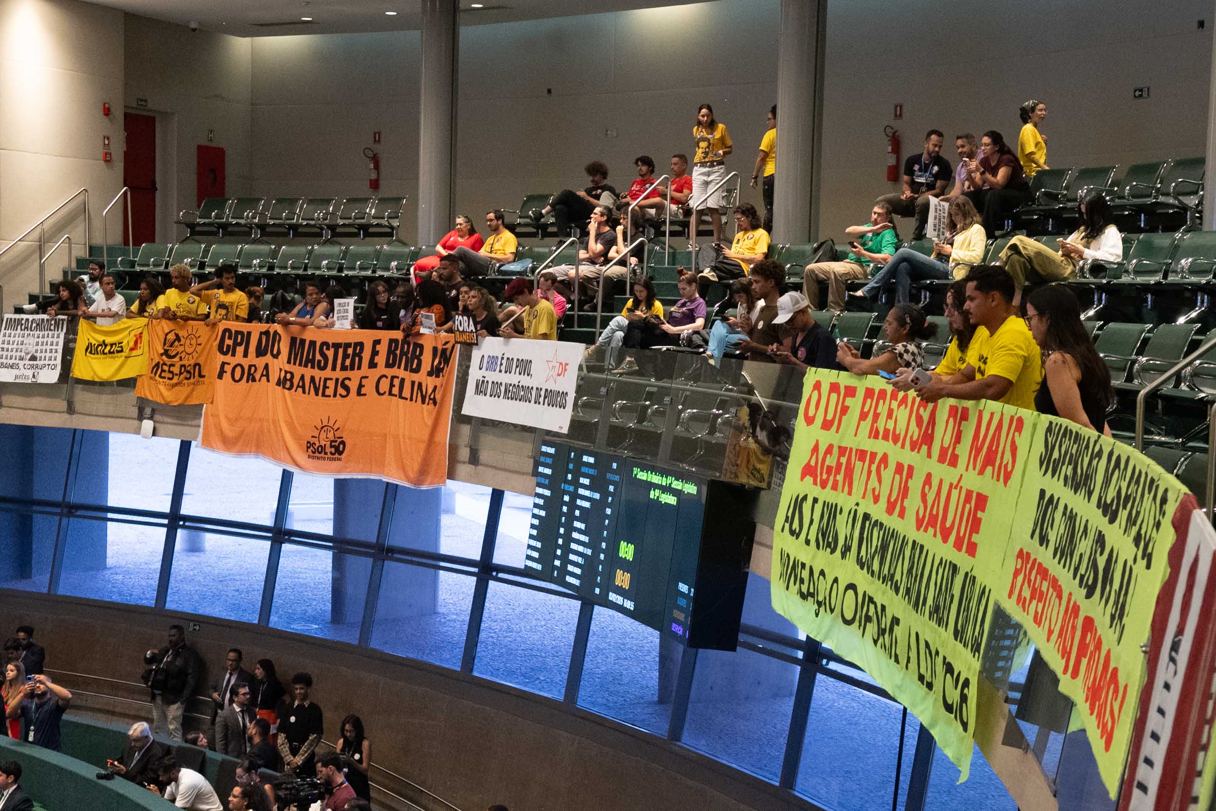 Durante a sessão, deputados da oposição fizeram um protesto contra o governador do DF, Ibaneis Rocha. Os distritais oposicionistas defenderam na tribuna a abertura de uma Comissão Parlamentar de Inquérito (CPI) para investigar as denúncias envolvendo a operação entre o Banco de Brasília (BRB) e o Banco Master, e pediram o impeachment do governador.