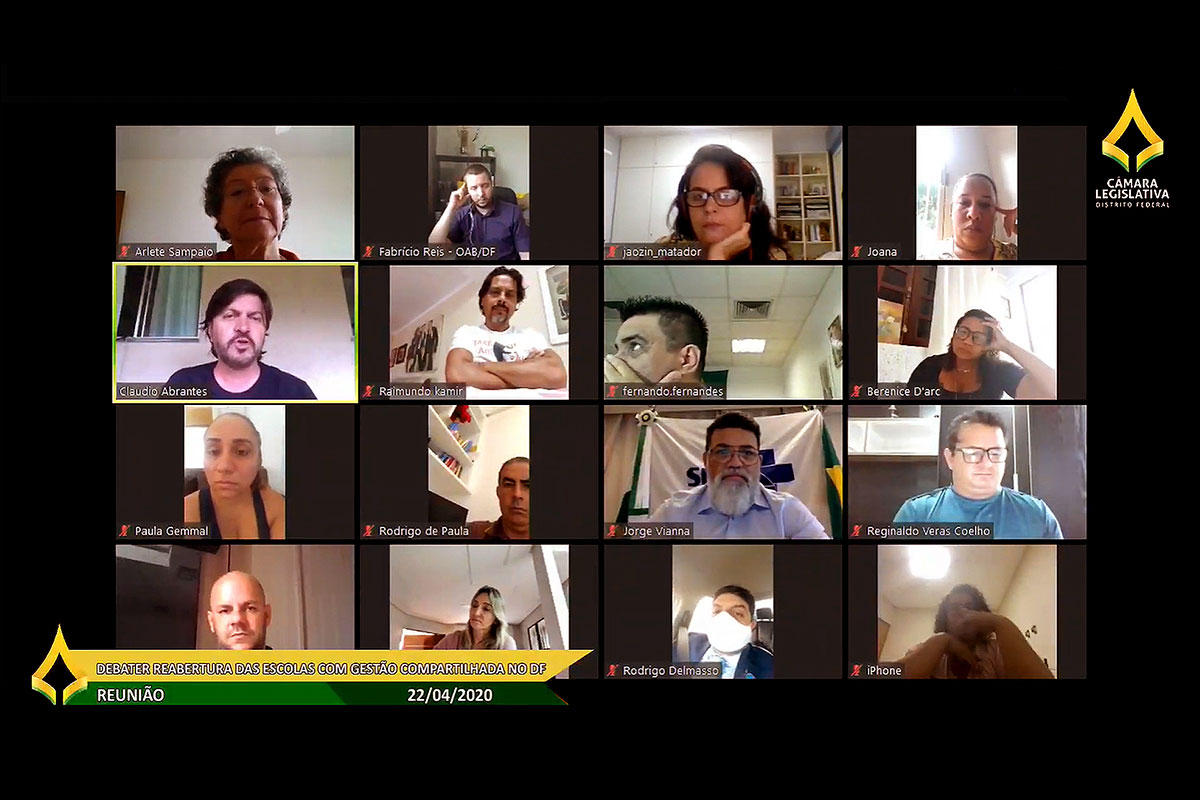 Participação – O líder do governo na CLDF, deputado Claudio Abrantes (PDT), considerou "importantíssima" a participação dos pais e entidades na reunião de hoje e defendeu a conduta do governador desde o início da crise. Lembrou que Ibaneis foi o primeiro governador do País a decretar a suspensão das aulas, entre outras medidas restritivas, o que levou o DF a apresentar um dos menores índices de letalidade do País neste momento da pandemia. Disse ainda que o governador tem observado boas experiências no trato com a crise, ao mencionar o modelo alemão na reabertura das escolas. Nesse sentido, o deputado Delmasso (Republicanos) referendou que o governador não tomaria uma atitude irresponsável. Por outro lado, o parlamentar ponderou que é necessário pensar sobre uma fase de transição, isto é, sair do isolamento social horizontal para o intermitente até chegar ao isolamento vertical.