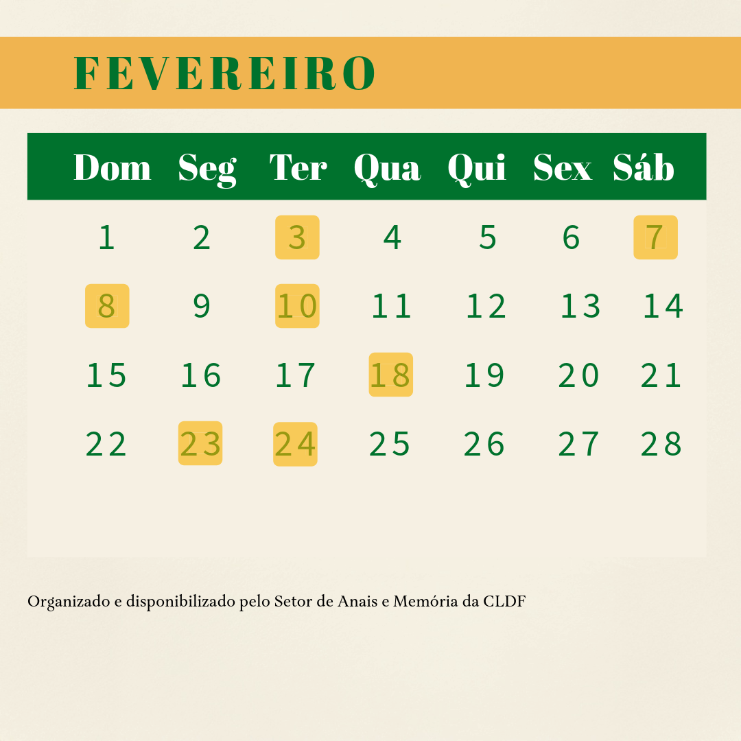 Em comemoração aos 65 anos de Brasília e 35 anos do Poder Legislativo Distrital, o Setor de Anais e Memória da Câmara Legislativa do Distrito Federal (CLDF) presenteia a sociedade com este Calendário de Datas Comemorativas.