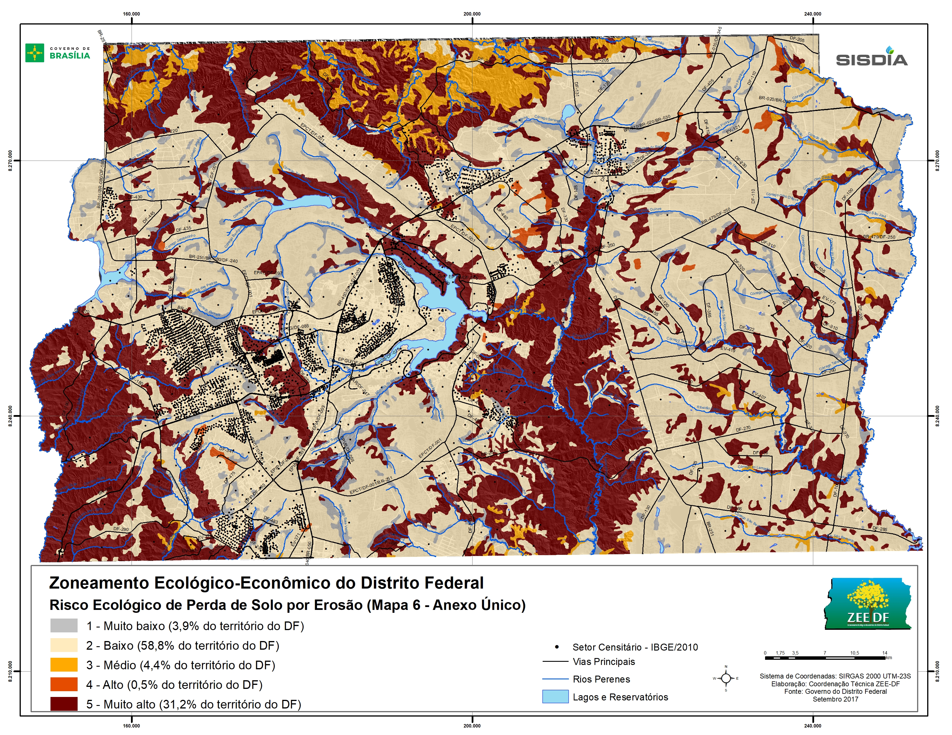 A recategorização que aqui será defendida, protegerá área classificada como do mais elevado risco de erosão, conforme mapa de risco ecológico de perda de solo por erosão constante do Zoneamento Ecológico Econômico do Distrito Federal (Lei 6269/2019, mapa 6: http://www.zee.df.gov.br/wp-content/uploads/2018/05/mapa-06-minuta-final.jpg).