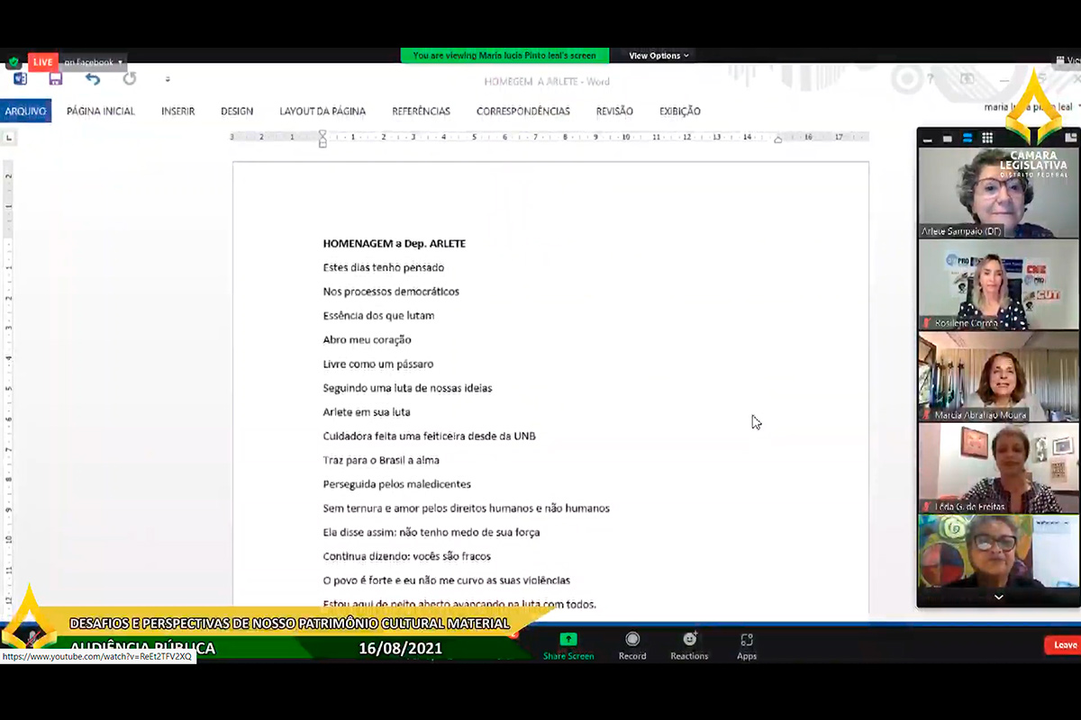 - AUDIÊNCIA PÚBLICA REMOTA Desafios e Perspectivas de nosso Patrimônio Cultural Material, Imaterial, Humano e Natural e Homenagem a Personagens e Instituições da História, da Cultura e da Educação do Distrito Federal