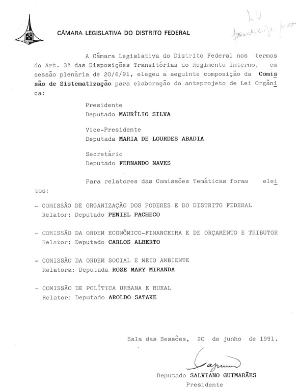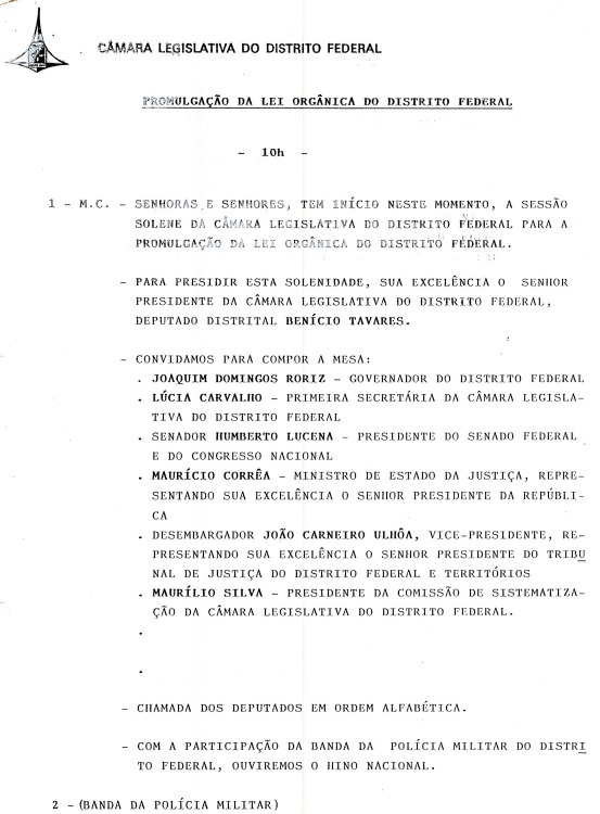 Em 2 de agosto de 1991, em frente à sede da CLDF, o presidente Dep. Salviano Guimarães declarou o início dos trabalhos de elaboração da Lei Orgânica.