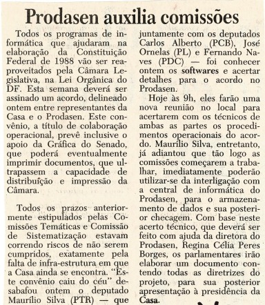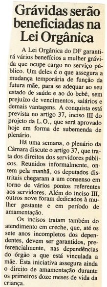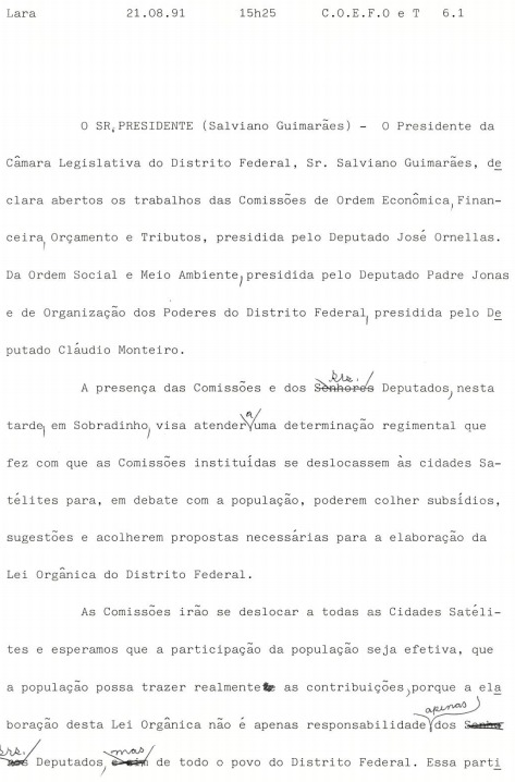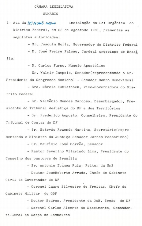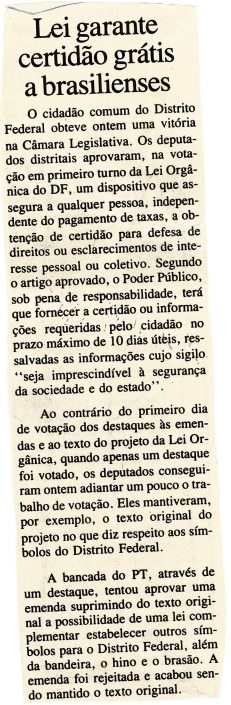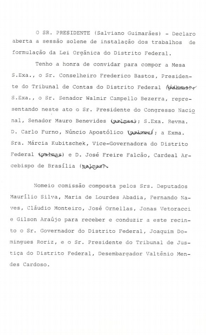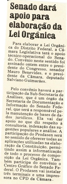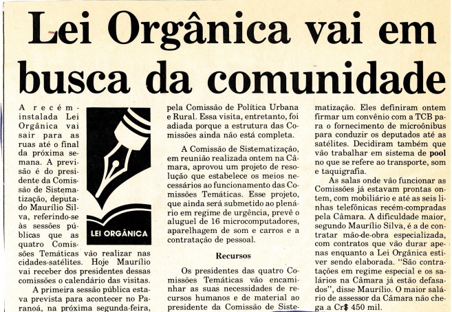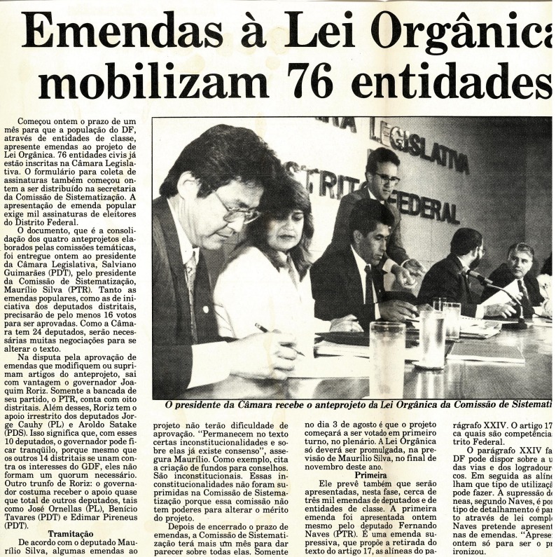 A seguir, apresentamos uma pequena seleção de fotos, documentos e reportagens que ilustram as atividades relacionadas à elaboração da Lei Orgânica do Distrito Federal e impacto social e político.
