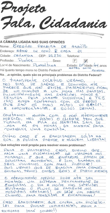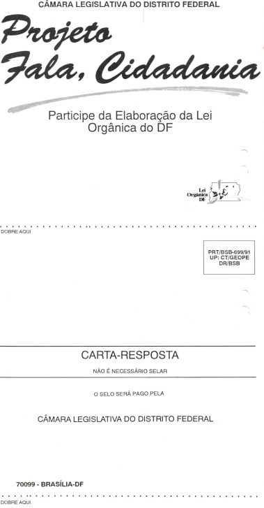 O Projeto Fala, Cidadania também incentivou a participação popular. Foram distribuídos 100 mil questionários em endereços relevantes do Distrito Federal. Neles, a população apontava suas sugestões e as encaminhava à CLDF, pelos Correios, gratuitamente.