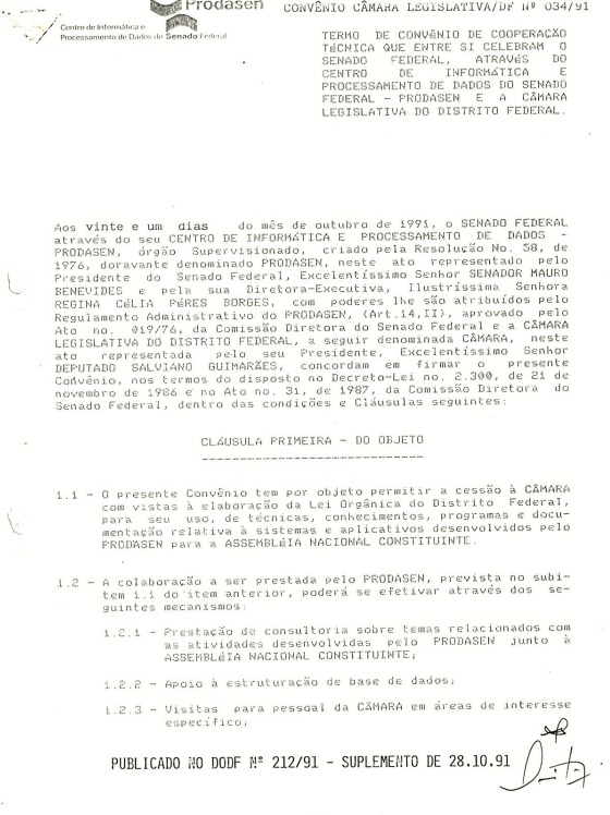 Em 21 de outubro de 1991, foi celebrado o Termo de Convênio de Cooperação Técnica entre o Senado Federal e a CLDF. Esse instrumento permitiu a cessão, pelo Centro de Informática e Processamento de Dados do Senado Federal, de sistemas, aplicativos e conhecimentos usados na elaboração da Constituição Federal de 1988 para a concepção da Lei Orgânica do DF.